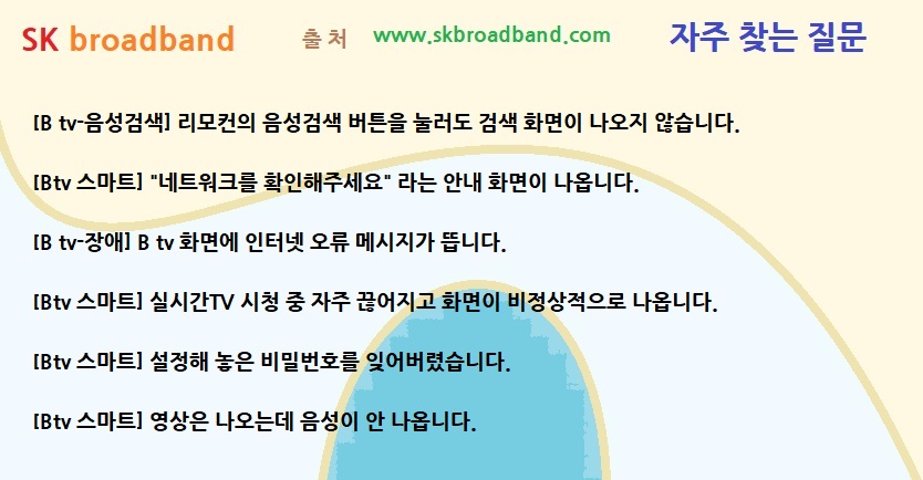 그래도 문제가 해결되지 않는 경우는 SK브로드밴드 고객센터(☎ 국번없이 106, 무료전화 080-8282-106)로 문의하여 주시기 바랍니다.
